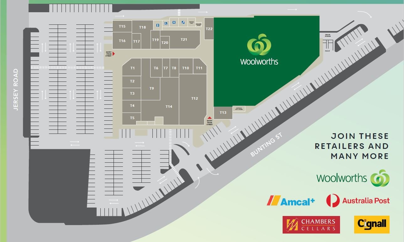 Development opened in December 2020, fully leased boasting a full line Woolworths supermarket with opportunities for approximately 20 specialty retailers along with 2 mini-majors across 3,242sqm of GLA. The Centre is supported by 308 at-grade car parking spaces with access directly from both Jersey Road and Bunting Street.