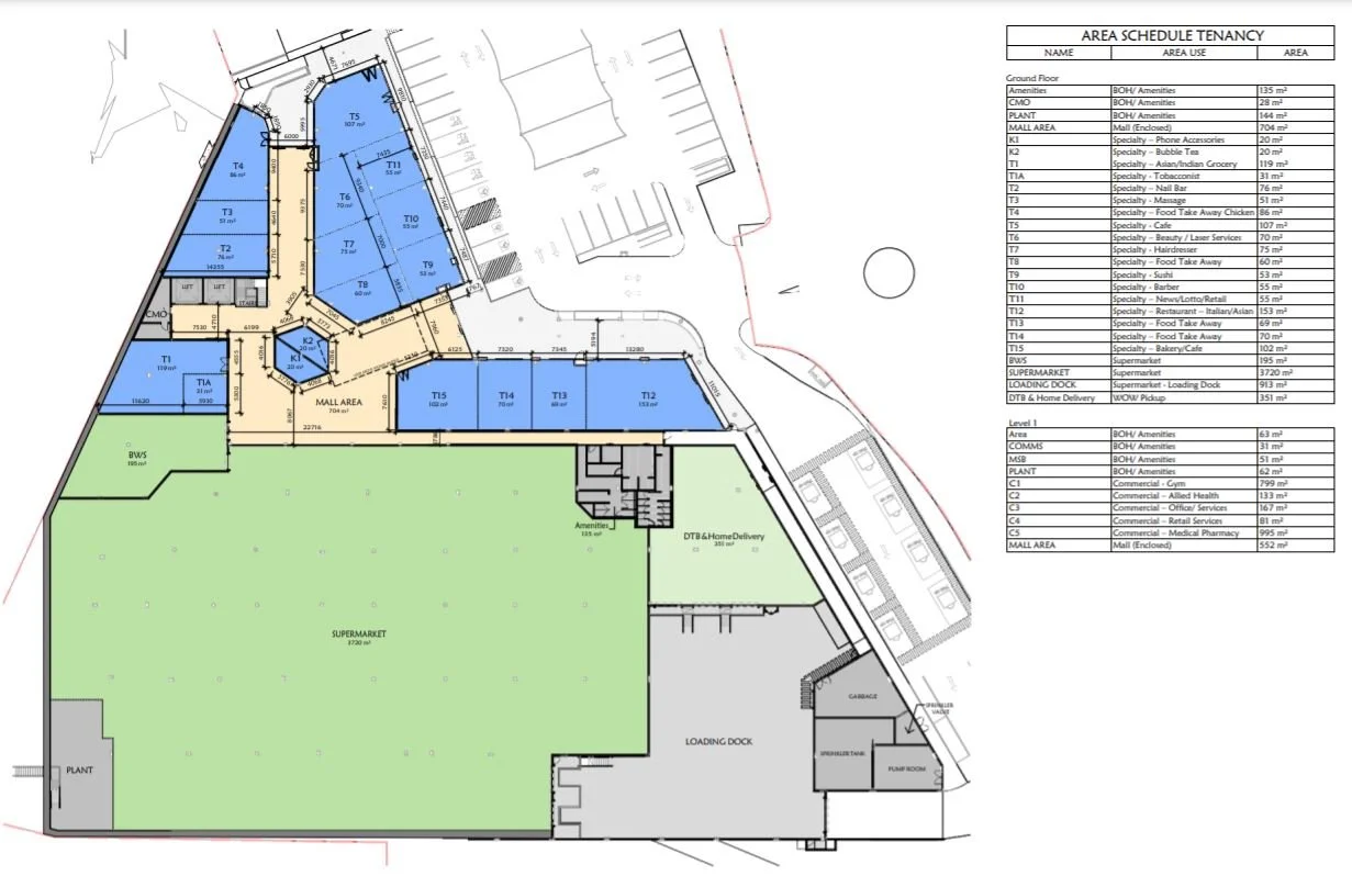 The specialty stores on ground level will be divided into approximately 16 tenancies, including 2 kiosks. It is proposed that a Liquor Store will occupy a space within the supermarkets.